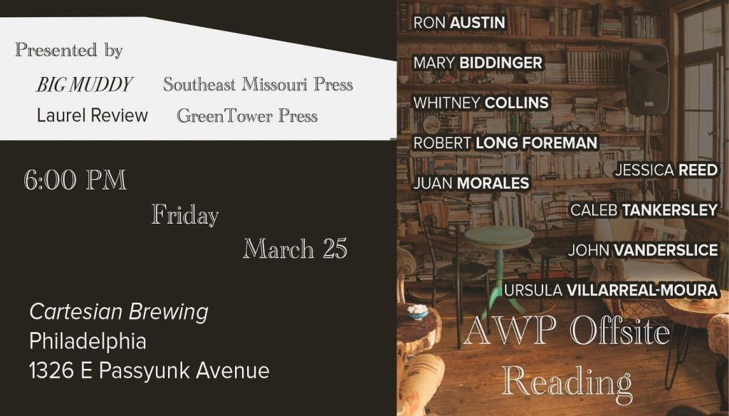 I’ll also be making a few appearances at AWP in Philadelphia. You can find me throughout the day at the Split/Lip Press table (469). If you’d like to purchase the book, come find me there! I’ll also be taking part in a reading for Big Muddy and Laurel Review at Cartesian Brewing on March 25. The details (along with all the other great writers) are in the image. I’ll be popping around to other readings and events to support friends, including a Friday night reading for Split/Lip at the Vox Populi art gallery.