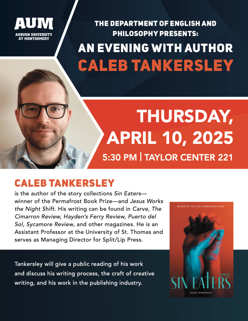 -In April 2025 I was a Visiting Writer on the campus of Auburn University Montgomery. I had a great time chatting with some interested students, reading from Sin Eaters, and sitting down for a wide-ranging conversation with my good friend, the writer Kent Quaney. A lovely time was had by all.